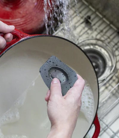 - For stubborn messes or stains, use our recommended Enameled Cast Iron Cleaner or a scraper to gently lift residue.